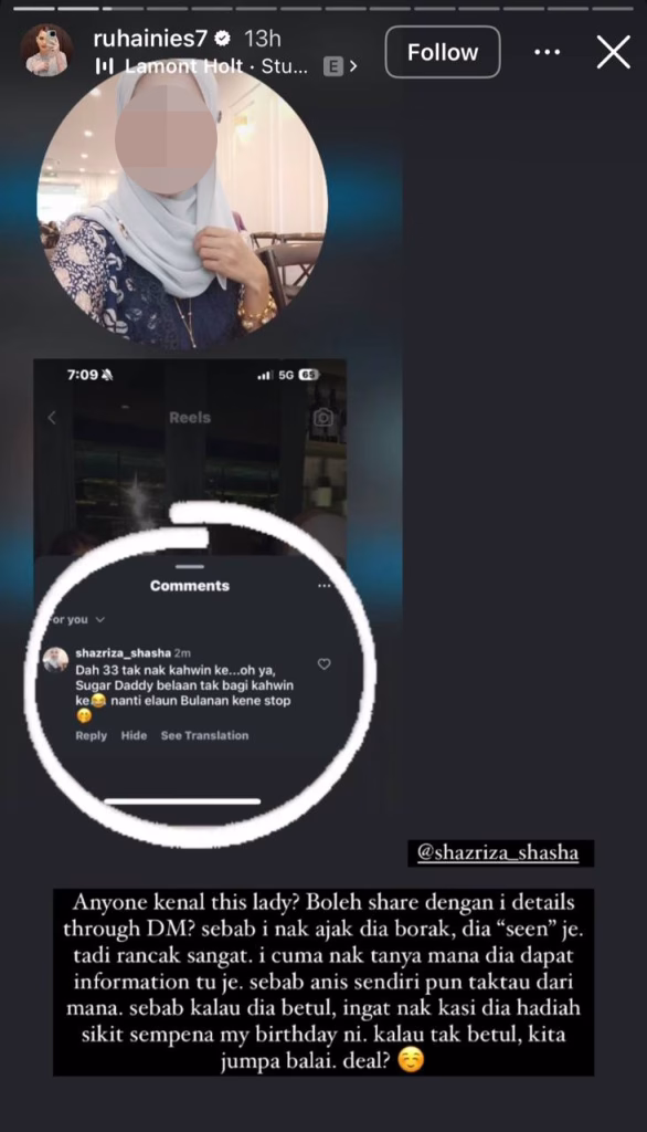 Segalanya bermula apabila seorang individu meninggalkan komen mendakwa gaya hidup Ruhainies ditaja oleh “sugar daddy”. Tidak berdiam diri, pelakon itu memuat naik tangkap layar komen berkenaan dan tampil mempertahankan diri secara terbuka.