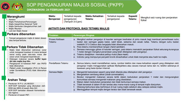 Prosedur Operasi Standard (SOP) bagi Perintah Kawalan Pergerakan Pemulihan (PKPP) di Kuala Lumpur (19 Mac – 31 Mac 2021) menetapkan, penganjuran majlis pernikahan adalah dibenarkan, namun tertakluk kepada syarat-syarat ketat. Jelas dinyatakan dalam protokol bagi tetamu majlis adalah: