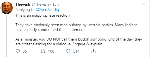 Tweet Syed Saddiq itu mengundang pelbagai reaksi netizen. Berdasarkan pemerhatian, ramai netizen yang berbangsa India tidak bersetuju dengan kenyataannya itu, malah menyelarnya kerana kedudukannya sebagai menteri adalah tidak sesuai menggunakan kata-kata sedemikian.