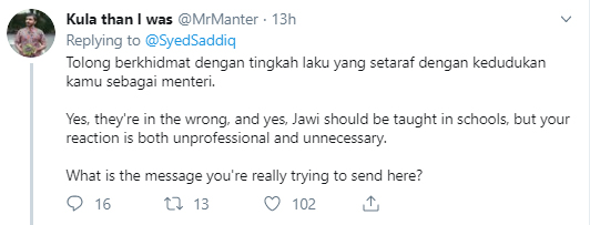 Awal pagi Isnin, Menteri Belia dan Sukan, Syed Saddiq memuat naik tweet yang menyelar tindakan Gabungan S.E.K.A.T yang mahu menghalang anak mereka ke sekolah kerana bantah keputusan berkenaan jawi, sebagai bodoh sombong.