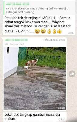 Viral di media sosial perbualan group WhatsApp di mana seorang individu mengaku telah bertindak meracun beberapa ekor anjing sehingga mati di kawasan perumahannya.