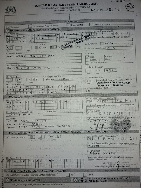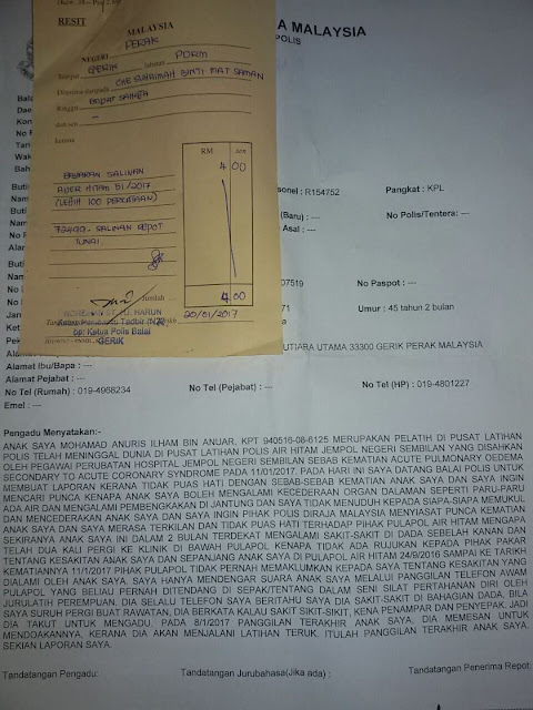 Sekarang anak saya disahkan mati akibat paru-paru ada air dan jantungnya bengkak. Tetapi apa puncanya menjadi seperti itu? Saya telah membuat laporan polis dan meminta pihak PDRM menjalankan siasatan yang telus dan adil.