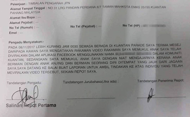 “Lebih kurang jam 12.30 pagi ketika berada di Kuantan Parade, saya menerima mesej dari kawan yang mengatakan rakaman video saya memukul anak saya telah diviralkan di laman Facebook Group Komuniti Kuantan oleh seorang individu.