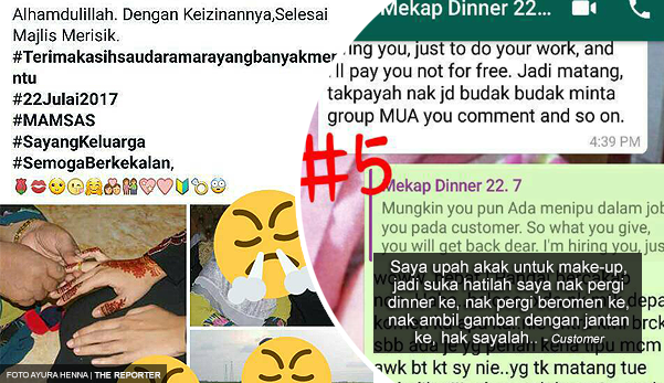 Make-up Artist (MUA) luah rasa kesal terhadap pelanggannya yang telah memperdayanya hanya kerana ingin mendapatkan harga perkhidmatan make-up yang murah. Pada awalnya, MUA berkenaan menyangka pelanggannya itu meminta khidmatnya untuk menghadiri majlis makan malam sempena majlis reunionnya. Namun setelah diselidik, rupa-rupanya dah kantoi dan make-up itu sebenarnya untuk majlis merisik. Alahai. Kenapa perlu menipu?