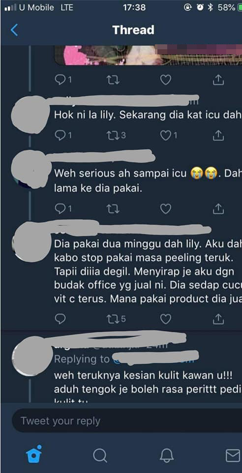 Mangsa yang tidak didedahkan identitinya itu difahamkan telah menggunakan produk tersebut selama dua minggu. Pada awalnya kulit mukanya mengalami pengelupasan dan rakannya menasihatkan berhenti menggunakan produk tersebut.