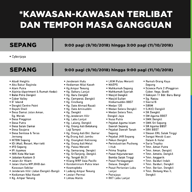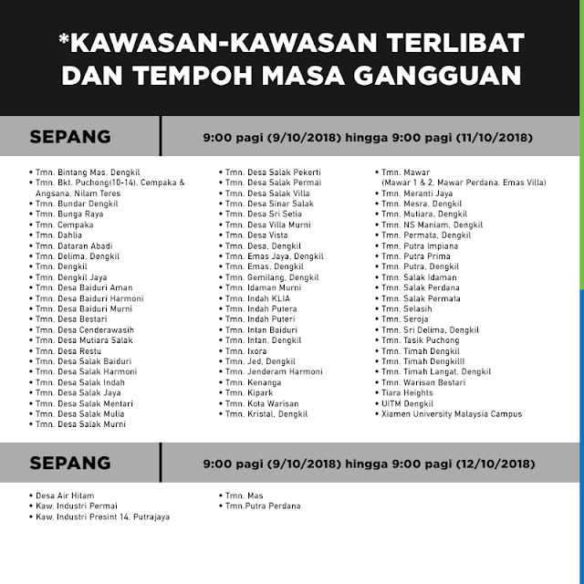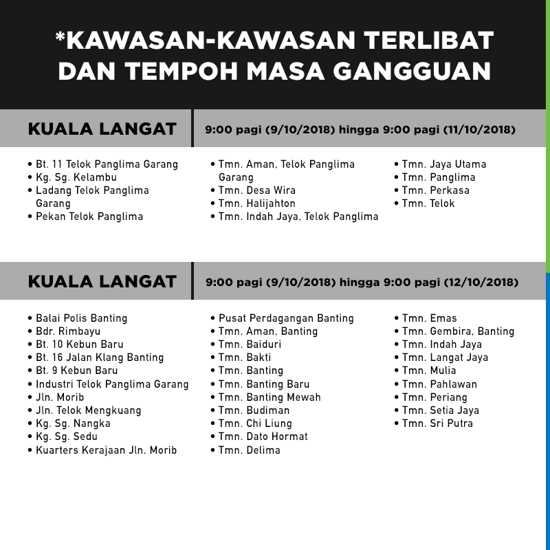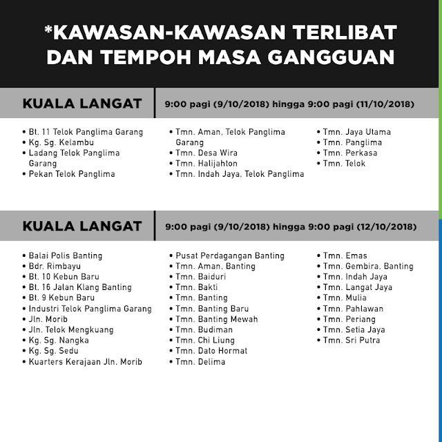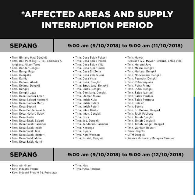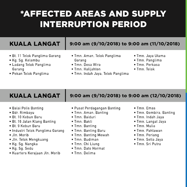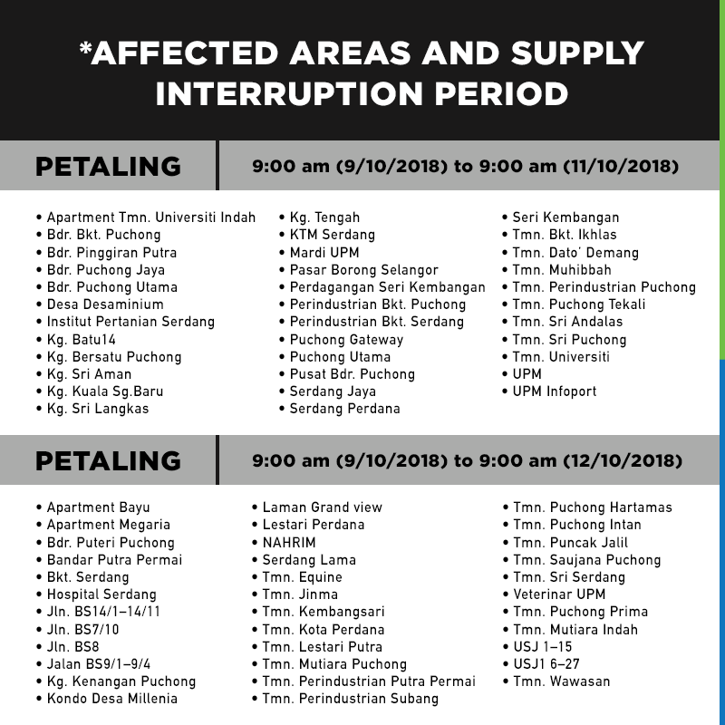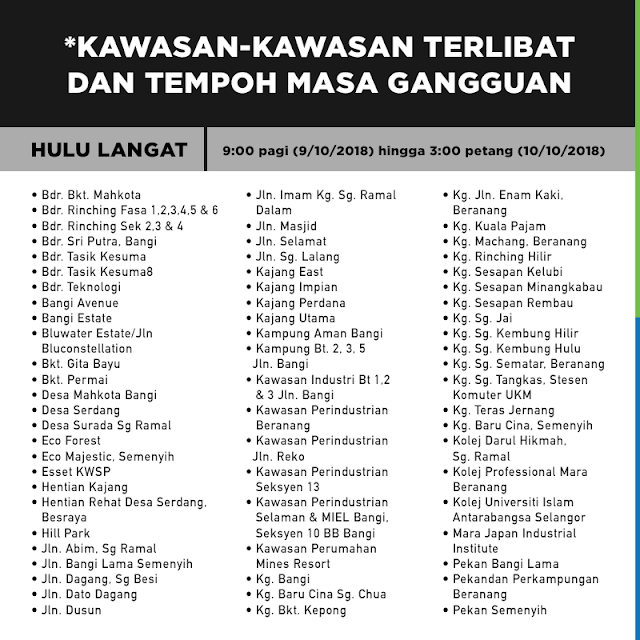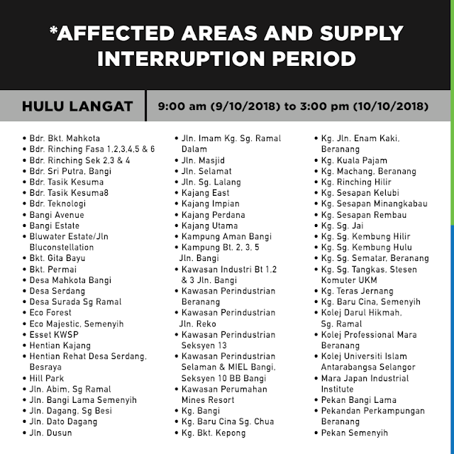 Syarikat Bekalan Air Selangor Sdn Bhd (SYABAS) mengumumkan empat daerah iaitu Petaling, Hulu Langat, Sepang dan Kuala Langat dan kawasan sekitarnya akan mengalami masalah gangguan air selama 72 jam bermula 9 hingga 11 Oktober 2018.