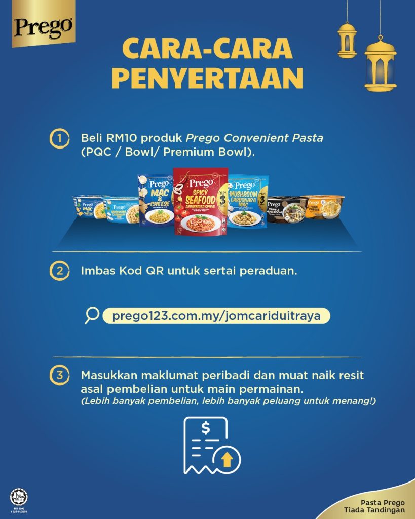 Maklumat lanjut tentang peraduan layari https://prego123.com.my/jomcariduitraya/ atau ikuti Prego di Facebook dan Instagram.