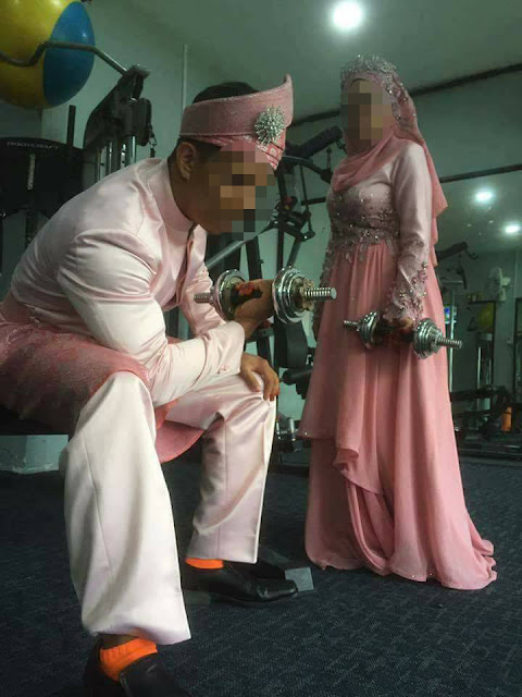 Gambar menunjukkan pasangan berkenaan merakam gambar perkahwinan mereka di sebuah gym dengan beberapa aksi yang menunjukkan betapa sado badan si suami.