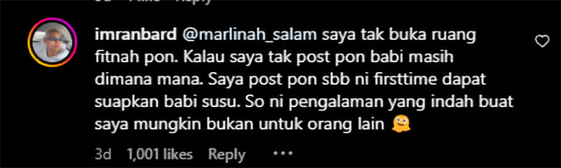 Imran kemudiannya membalas teguran tersebut dengan menafikan dakwaan bahawa dia membuka ruang fitnah. Dia menegaskan, posting tersebut adalah berkongsi pengalaman peribadinya.