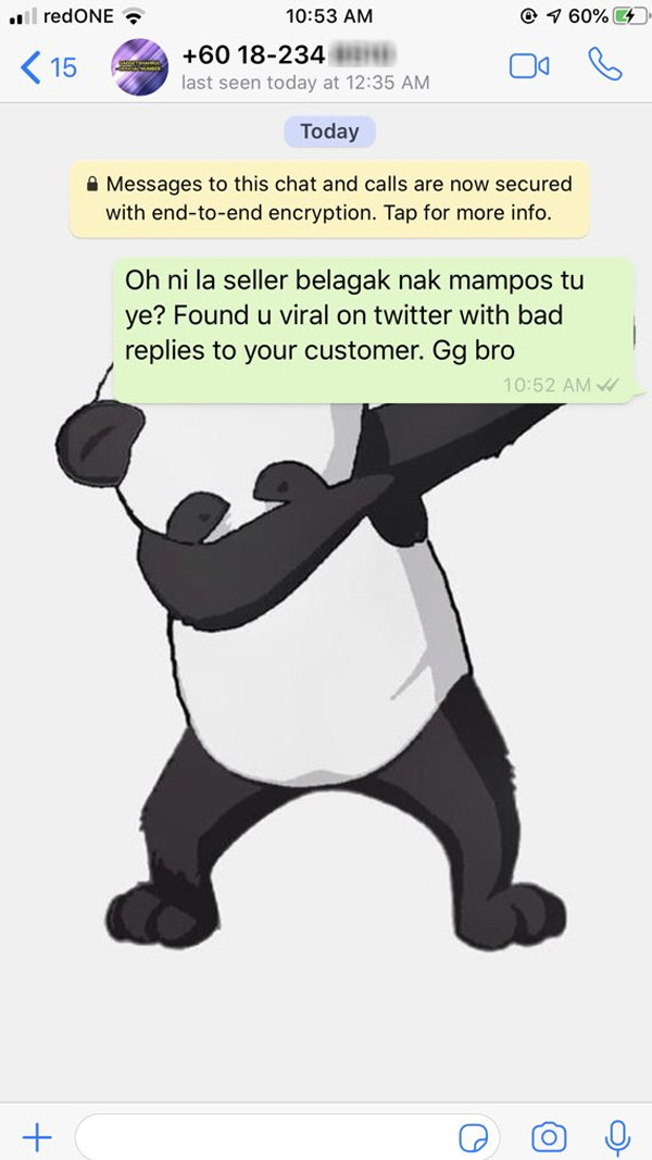 Perkongsian itu menjadi viral dan netizen memilih untuk mempertahankan Arif dengan menyerang Instagram dan WhatsApp peniaga biadab itu.