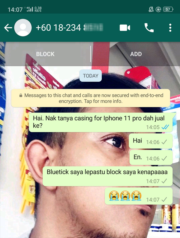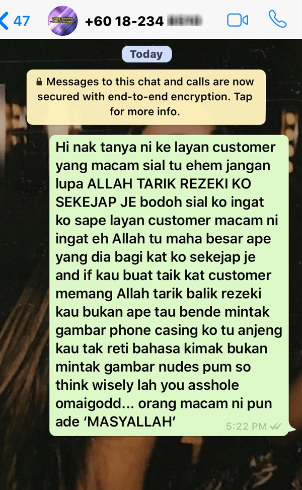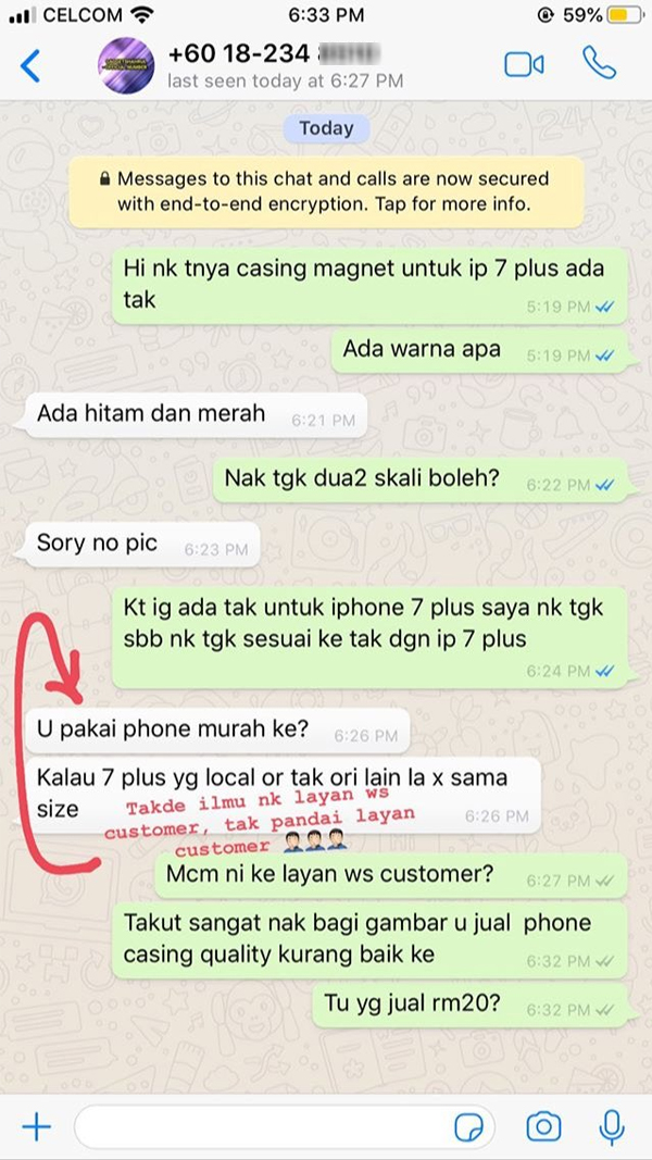 “Eh kesah pulak. Bagi gambar? Kelakar nak cakap pasal takut tak sama size kat sini. Ingat kitorang jual cikai-cikai ke? Tak tahu beza size takat phone 7 plus tuh. Aduhai.. demand je lebih.