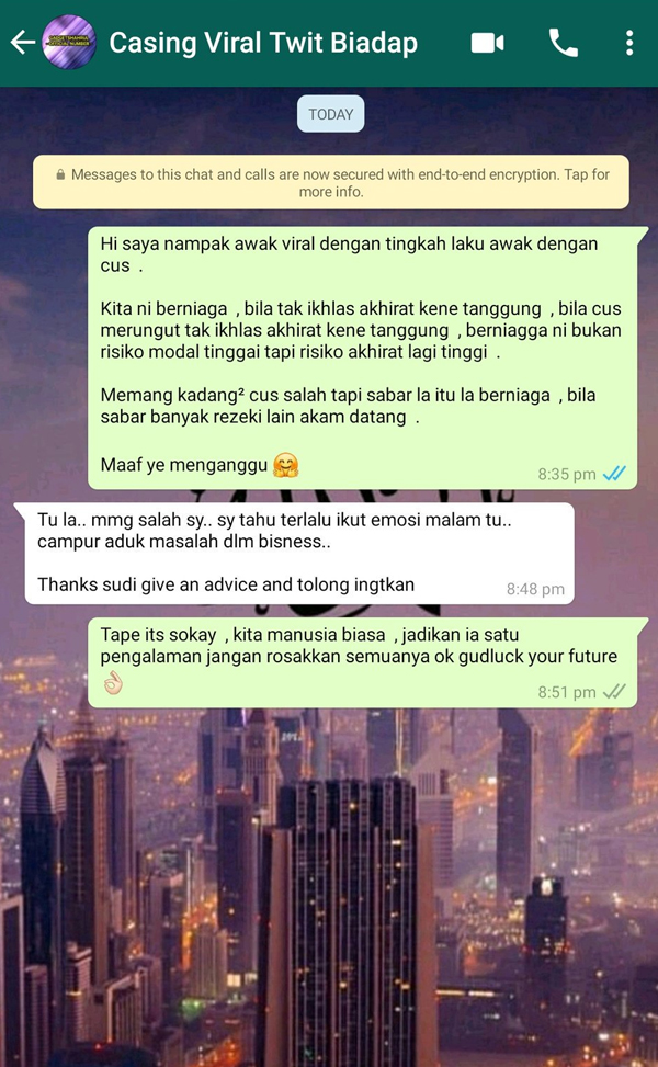 Kata orang, berniaga memerlukan kesabaran yang tinggi. Kalau tiada kesabaran, elok berhenti berniaga kerana kebiadaban itu kelak akan memakan diri.