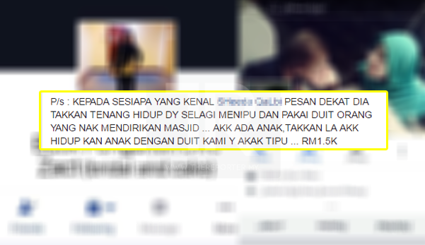 “Akak ada anak, takkan akak nak sara anak dengan duit kami yang akak tipu? RM1,500 itu mungkin tidak banyak bagi sesetengah orang, tetapi bagi saya dan suami, duit itu boleh jadi gaji sebulan saya.