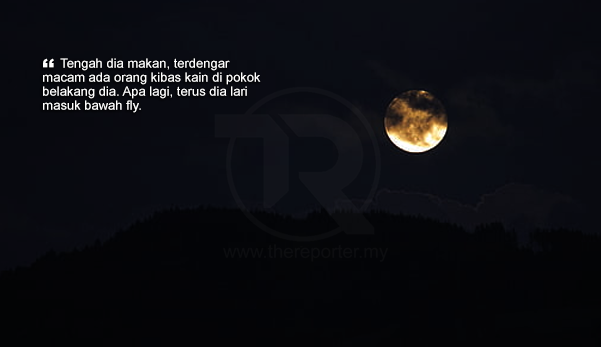 Tengah dia makan, terdengar macam ada orang kibas kain di pokok belakang dia. Apa lagi, terus dia lari masuk bawah fly. Kawan-kawan yang lain tengok dia tiba-tiba berlari tanyalah kenapa. Dia kata di luar sejuk sangat sebab itu dia masuk bawah fly.