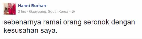 Dalam waktu yang sama, Hanni juga memuat naik beberapa status lain yang mendakwa ada ramai orang yang seronok dengan kesusahan yang dihadapinya.