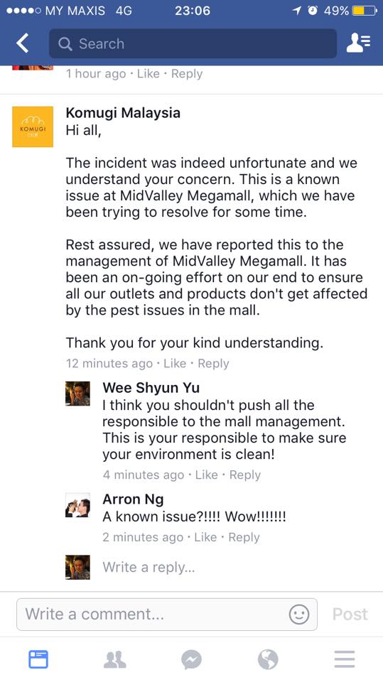 Lapor Hype.my, tidak beberapa lama kemudian, komen Wee Shyun Yu telah dipadamkan. Tindakan pihak pengendali laman Facebook Komugi itu jelas sekali tidak profesional dalam soal menangani aduan pelanggan.