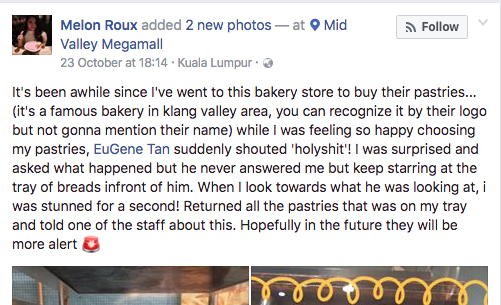 Melon Roux, individu yang memuat naik gambar tersebut di laman Facebook berkata, beliau tidak menyangka kedai bakeri yang popular di Klang Valley itu tidak menyedari kehadiran tikus yang telah mencemari roti mereka.
