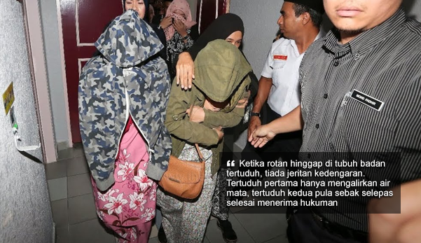 Tertuduh pertama berusia 32 tahun itu dilihat mengalirkan air mata selepas hukuman rotan enam kali itu selesai tetapi tertuduh kedua (22 tahun) sebak seketika apabila menerima sebatan ketiga dan terpaksa dihentikan seketika sebelum menyambung tiga sebatan seterusnya.