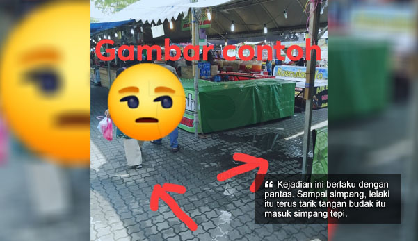 Kejadian ini berlaku dengan pantas. Sampai simpang, lelaki itu terus tarik tangan budak itu masuk simpang tepi. Si mak jalan terus tak tahu apa pun yang terjadi. Nampak macam lelaki itu sudah lama memerhatikan akak itu. Cuma tunggu masa saja nak buat kerja.