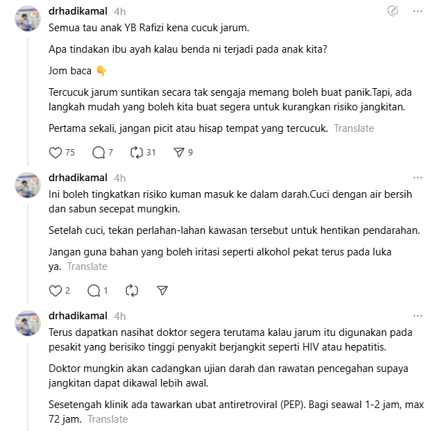Susulan insiden anak Ahli Parlimen Pandan, Rafizi Ramli, dicucuk jarum oleh individu tidak dikenali, seorang doktor perubatan dikenali sebagai Dr Hadi tampil berkongsi panduan penting mengenai langkah segera yang perlu diambil sekiranya perkara sama berlaku kepada anak atau ahli keluarga.