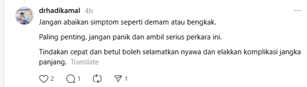 Dalam pada itu, beliau mengingatkan supaya tidak mengabaikan sebarang gejala seperti demam atau bengkak pada kawasan terlibat.