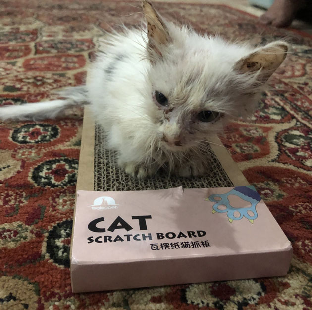Doktor memaklumkan, keadaan gusi anak kucingnya pucat dan tidak dapat disuntuk disebabkan darah kurang. Hanya perlu diberi makanan secara perlahan-lahan selang dua jam sekali.
