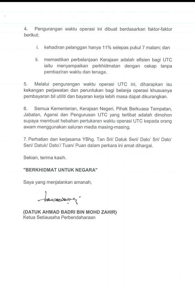 “Pengurangan waktu operasi ini dibuat berdasarkan faktor kehadiran pelanggan hanya 11% selepas jam 7 malam dan bagi memastikan perbelanjaan kerajaan adalah efisien bagi UTC iaitu menyampaikan perkhidmatan dengan cekap tanpa pembaziran waktu dan tenaga.