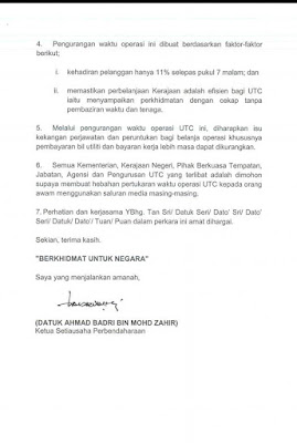 “Melalui pengurangan waktu operasi UTC ini, diharapkan isu kekangan perjawatan dan peruntukan bagi belanja operasi khususnya pembayaran bil utiliti dan bayaran kerja lebih masa dapat dikurangkan,” katanya dalam surat makluman bertarikh 12 Disember 2018.