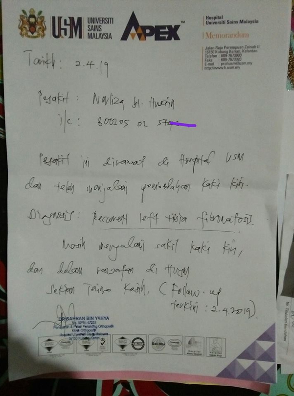 “Doktor maklumkan ada masalah, tulang itu tidak cantik, nampak kesan-kesan putih. Berkemungkinan tulang itu mudah reput atau patah, atau kembali seperti sebelum ini.