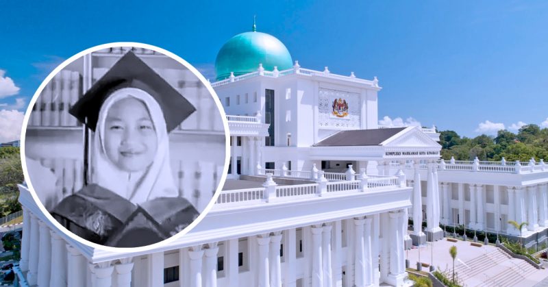 Imej menunjukkan bangunan Mahkamah Koroner Kota Kinabalu berlatar belakang langit biru dengan kubah hijau, bersama sisipan gambar hitam putih remaja perempuan bertudung dan berjubah konvokesyen.
