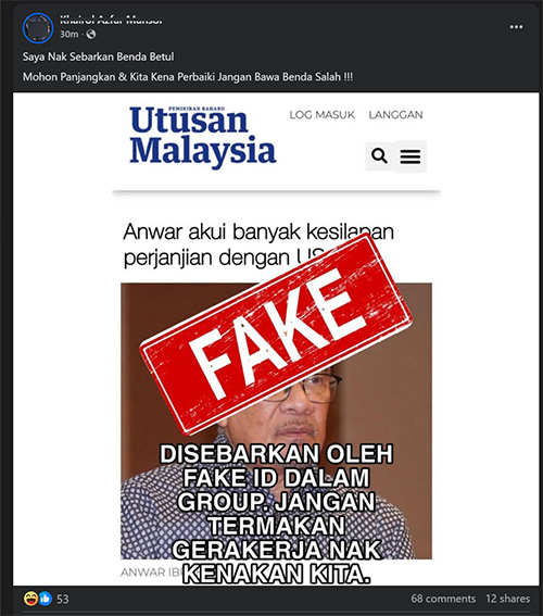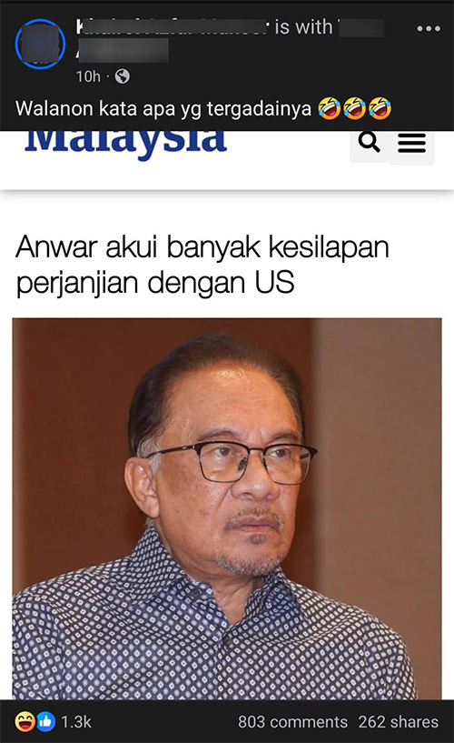 Satu hantaran tular di Facebook mendakwa kononnya akhbar Utusan Malaysia menyiarkan berita bertajuk “Anwar akui banyak kesilapan perjanjian dengan US”, sekali gus mengundang pelbagai reaksi pengguna media sosial.
