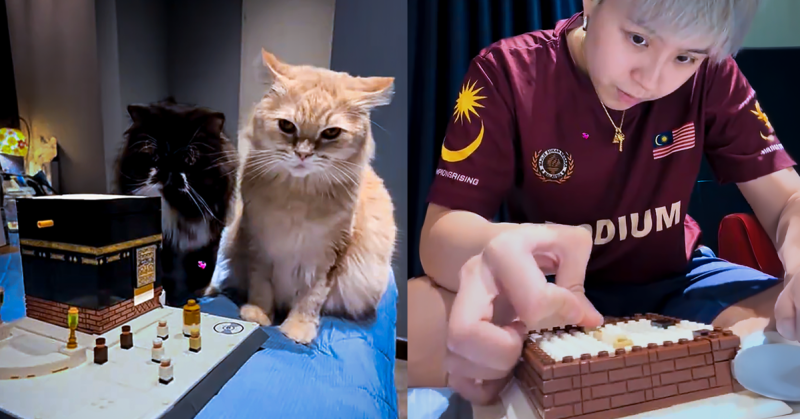 Dalam video tersebut, Ee Wei dilihat tekun menyusun satu persatu lego berbentuk Kaabah sambil ditemani kucing kesayangannya.