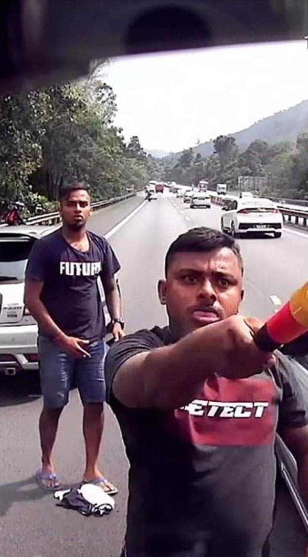 Dua lelaki keluar dan mula memarahi pemandu lori, salah seorang mengeluarkan alat pengunci stereng untuk mengancam mencederakan pemandu lori.
