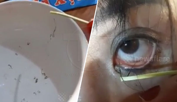 Klip video yang kurang menyenangkan menunjukkan parasit berukuran 5 sentimeter dikeluarkan dari mata seorang pesakit wanita.