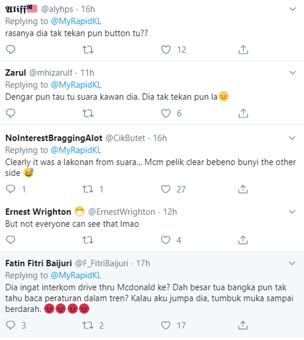 Tweet yang dimuat naik @MyRapidKL semalam, “Peringatan, menyalahgunakan peralatan interkom dalam tren adalah kesalahan serius.