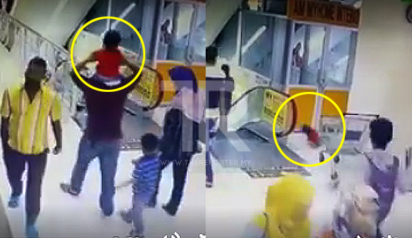 Dalam kejadian jam 6.30 petang di eskalator Kompleks Bukit Jambul semalam, mangsa yang berusia tiga tahun itu didukung oleh bapanya di atas bahu sambil menaiki eskalator.