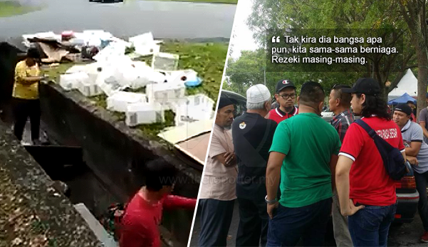 Beberapa individu yang dipercayai peniaga di bazar itu tampil membantu mangsa mengambil kesemua barang-barangnya dalam longkang sebelum mereka beramai-ramai menyerbu dan mempersoalkan tindakan lelaki terbabit yang dianggap tidak wajar.