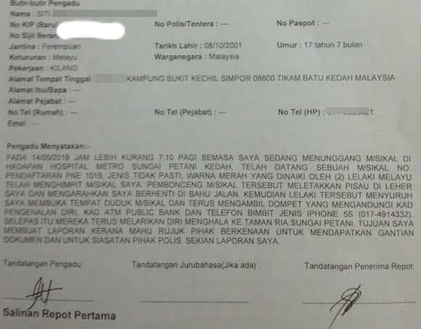 “Semasa saya sedang menunggang motosikal, datang sebuah motosikal suspek yang telah menghimpit saya dan pemboncengnya meletakkan pisau di leher, mengarahkan saya berhenti di bahu jalan.