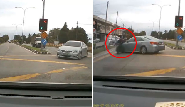 Seorang penunggang motosikal terbabit dalam kemalangan yang disebabkan sebuah kereta yang membuat pusingan U secara tiba-tiba di sebuah persimpangan.