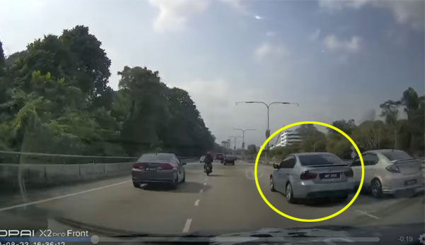 Seorang pengguna jalan raya nyaris kemalangan gara-gara tindakan pemandu kereta BMW berwarna kelabu yang memandu secara berbahaya.