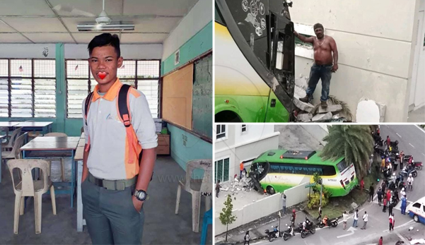 Pemandu bas yang hilang kawalan lalu melanggar sebuah lagi motosikal yang diparkirkan di tepi jalan sebelum menuju ke persimpangan lampu isyarat lalu merempuh mangsa yang sedang berhenti di persimpangan itu sebelum merempuh tembok batu pagar perumahan berhampiran.