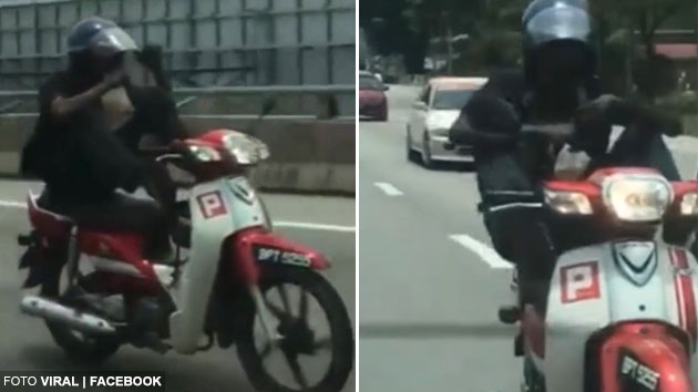 Video berdurasi 1 minit 27 saat menunjukkan, lelaki terbabit meletakkan kedua-dua belah kakinya di bahagian handle motosikal, sementara tangannya memegang sebungkus teh ais.