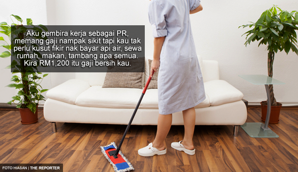 Aku dah bekerja sebagai PR sejak empat tahun lepas dengan gaji RM1,200. Kenapa aku bekerja sebagai PR? Sebabnya tempat tinggal disediakan (dapat bilik dan bilik air sendiri). Makan percuma (makan mewah wehh!)