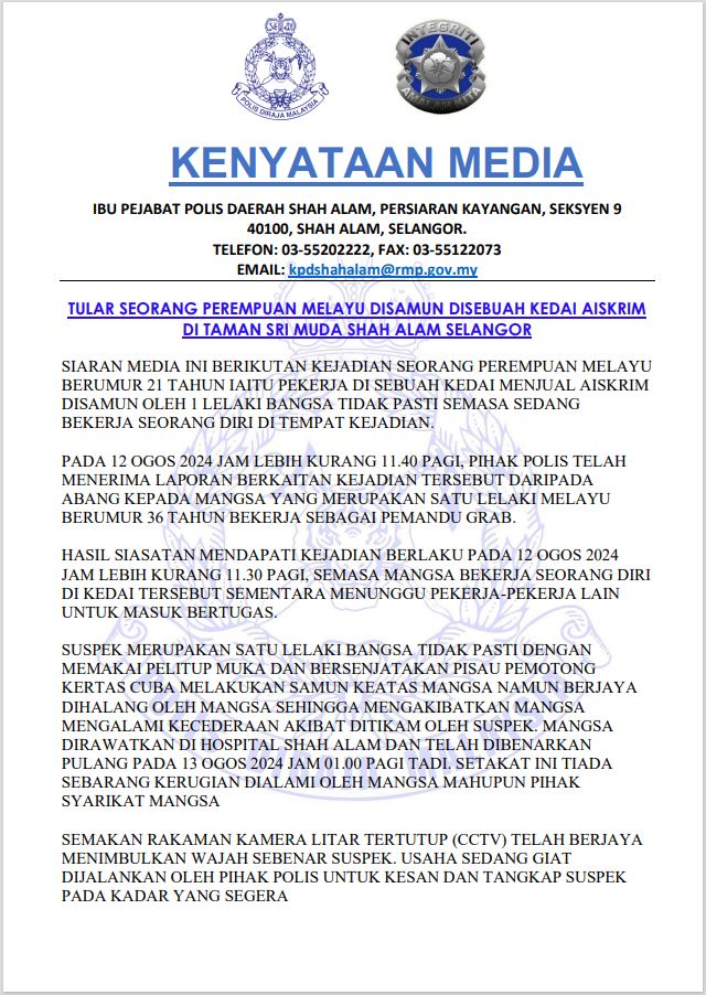 Seorang wanita mengalami cedera parah dalam satu kejadian rompakan di sebuah francais kedai aiskrim Mixue berdekatan dengan Taman Sri Muda, Shah Alam, Selangor.