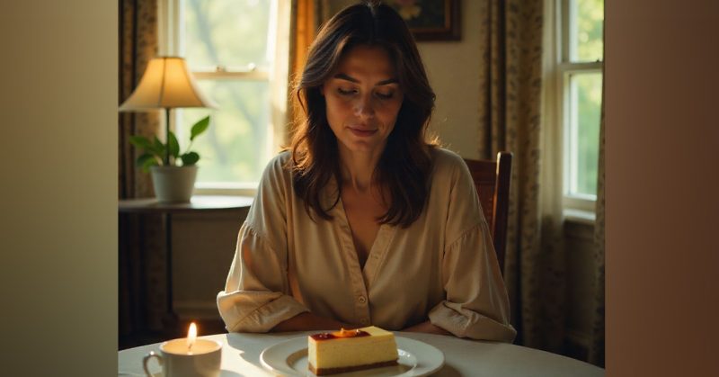 Seorang wanita duduk sendirian di meja makan dengan sisa kek keju di hadapan, simbolik kepada kekecewaan dan rasa terabai dalam perkahwinan.