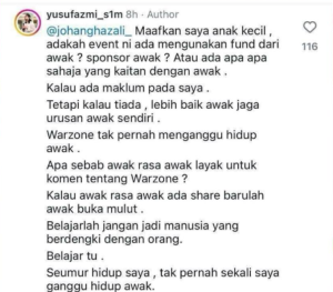 “Warzone tak pernah mengganggu hidup awak. Apa sebab awak rasa awak layak untuk komen tentang Warzone?”